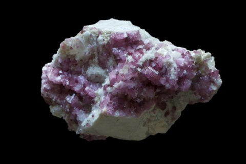 An elegant specimen. Many deep pinkish-coloured crystals of Tourmaline are set upon a matrix of white feldspar.